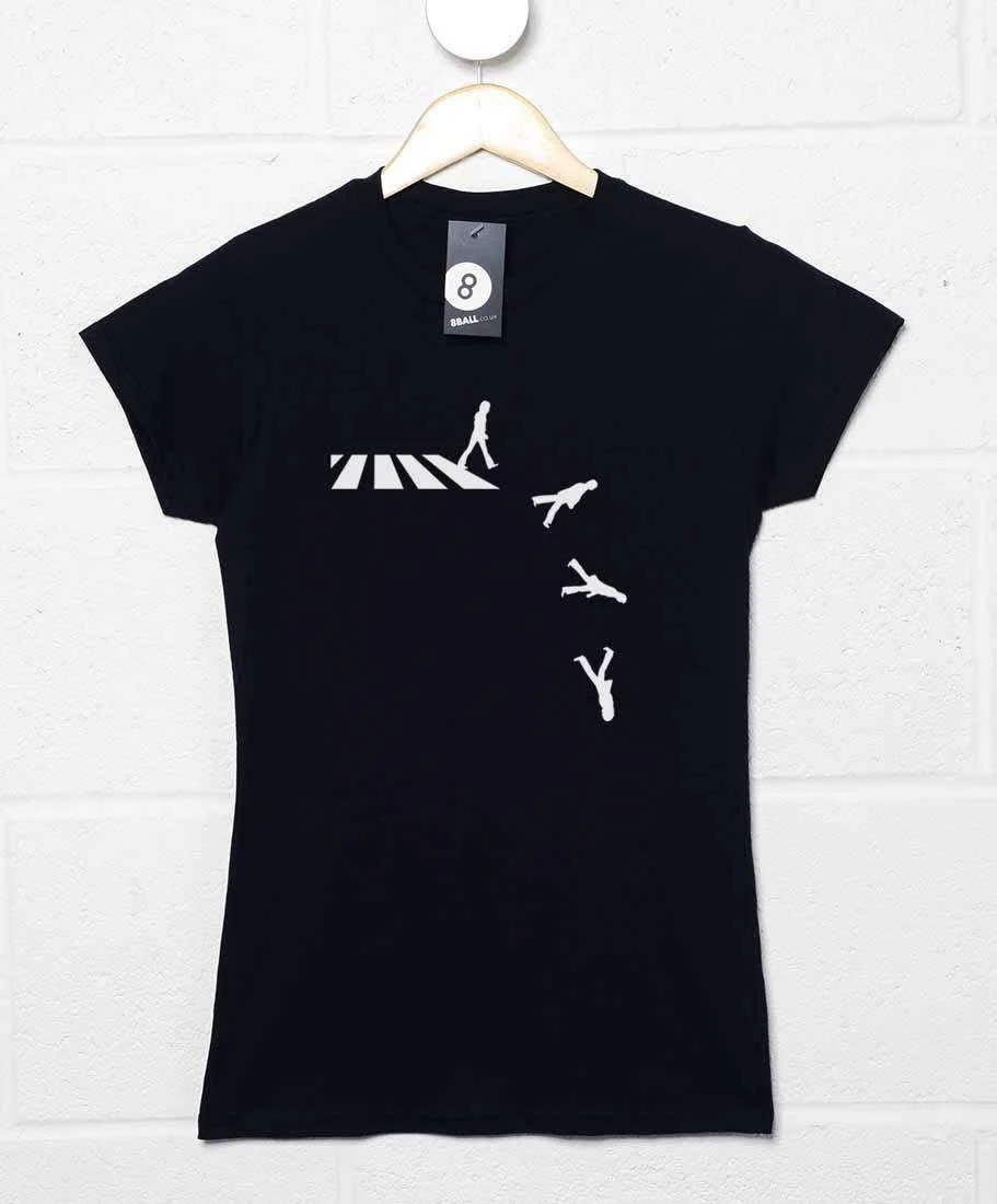 This funny womens t-shirt has the Fab Four falling off the zebra crossing seen on the famous Abbey Road album cover. In a retro style with a one colour print!