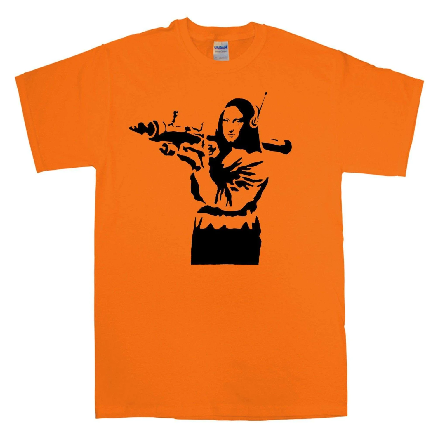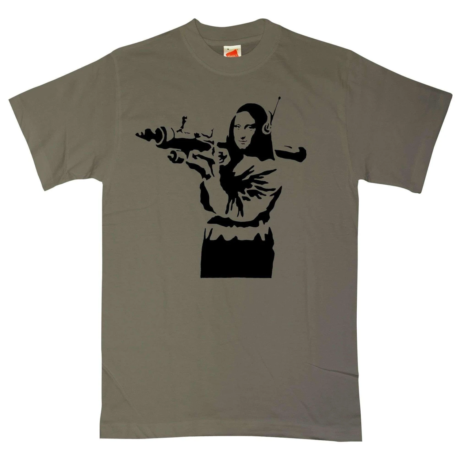 This Banksy t-shirt features a grafitti stencil style design showing Banksy’s Mona Lisa piece. For years people have wondered what was behind the most famous smile in art, but now Banksy has answered the question – she smiles like that because she owns a large bazooka! This is a 100% cotton Banksy tshirt. 10% of all royalties from our Banksy t-shirt range are donated to charity. You can find out more about the charities which 8Ball supports in the help section of our website. Thanks for your support.