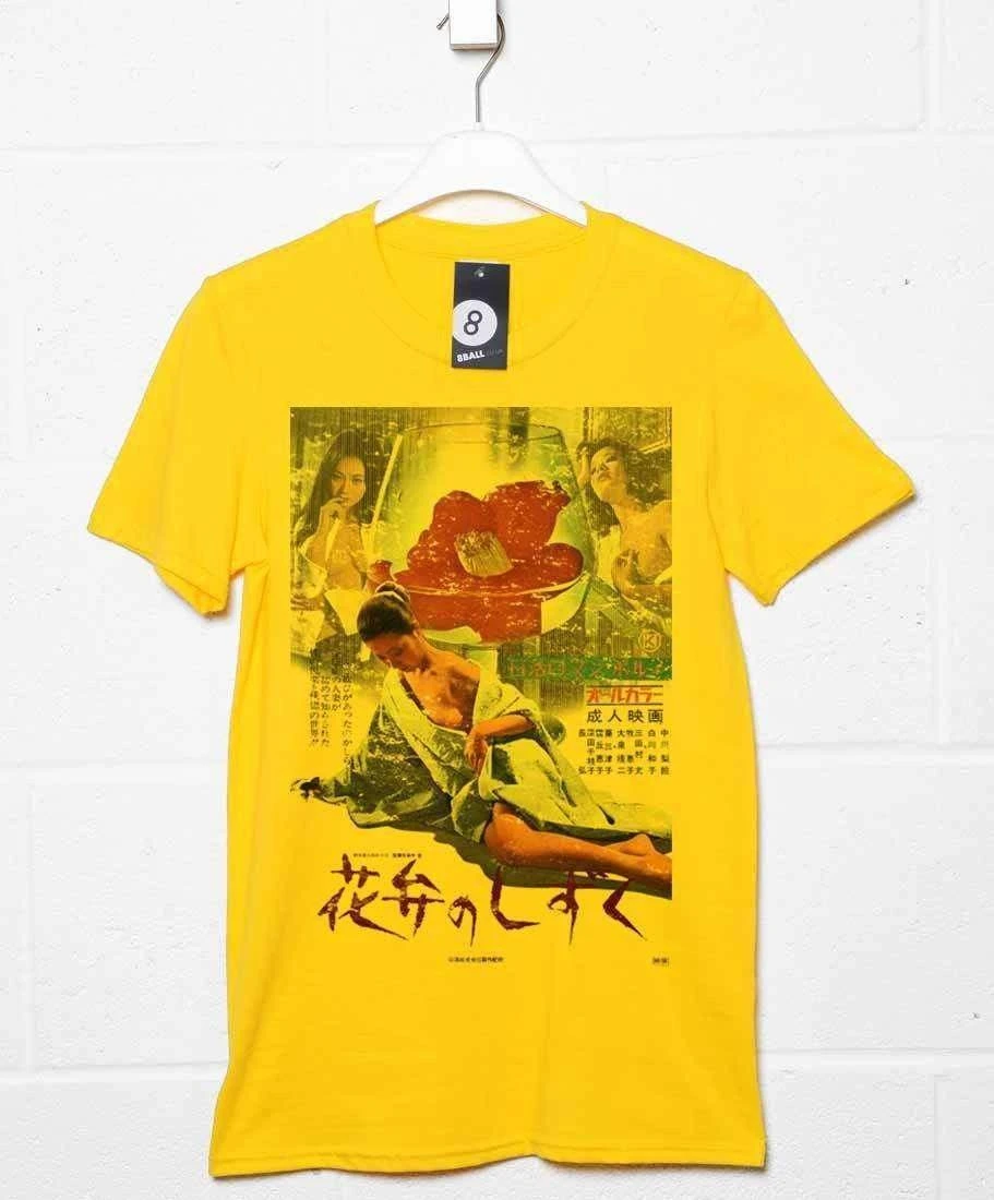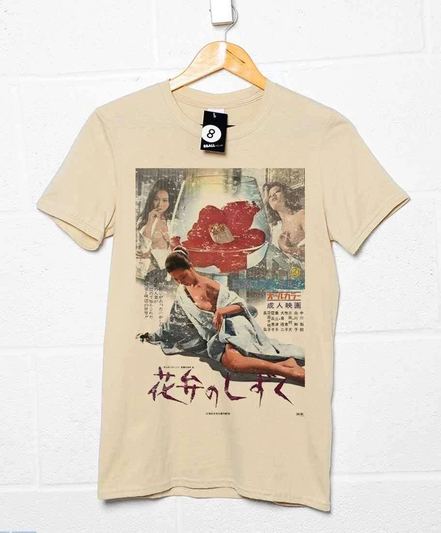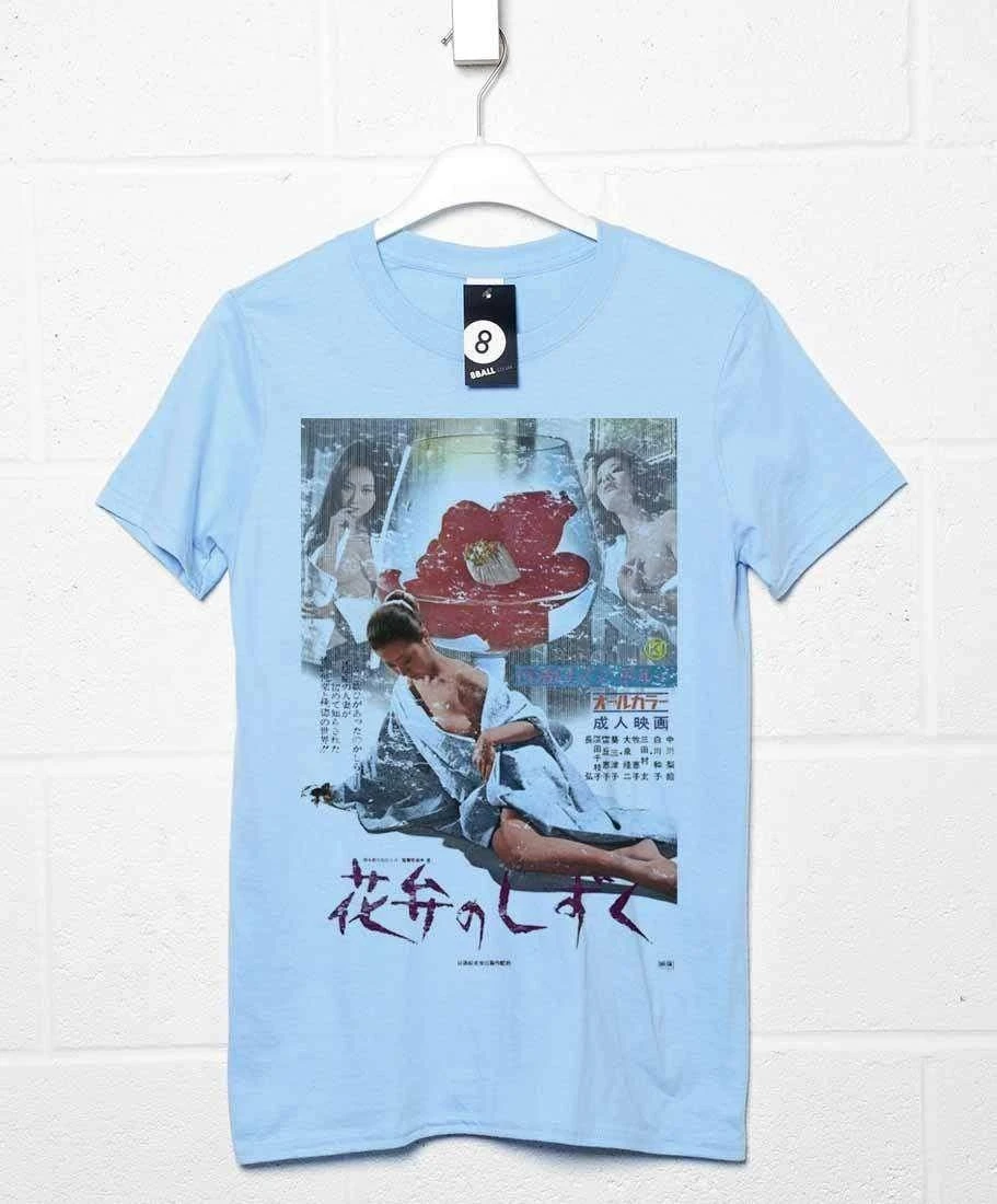 This Deathray t-shirt features a retro-look, distressed print of artwork from an old school sexy Japanese movie. Shows a woman in a blue kimono, with other scantily clad women behind and an image of a flower floating in a glass. This is a 100% cotton Deathray t shirt.
