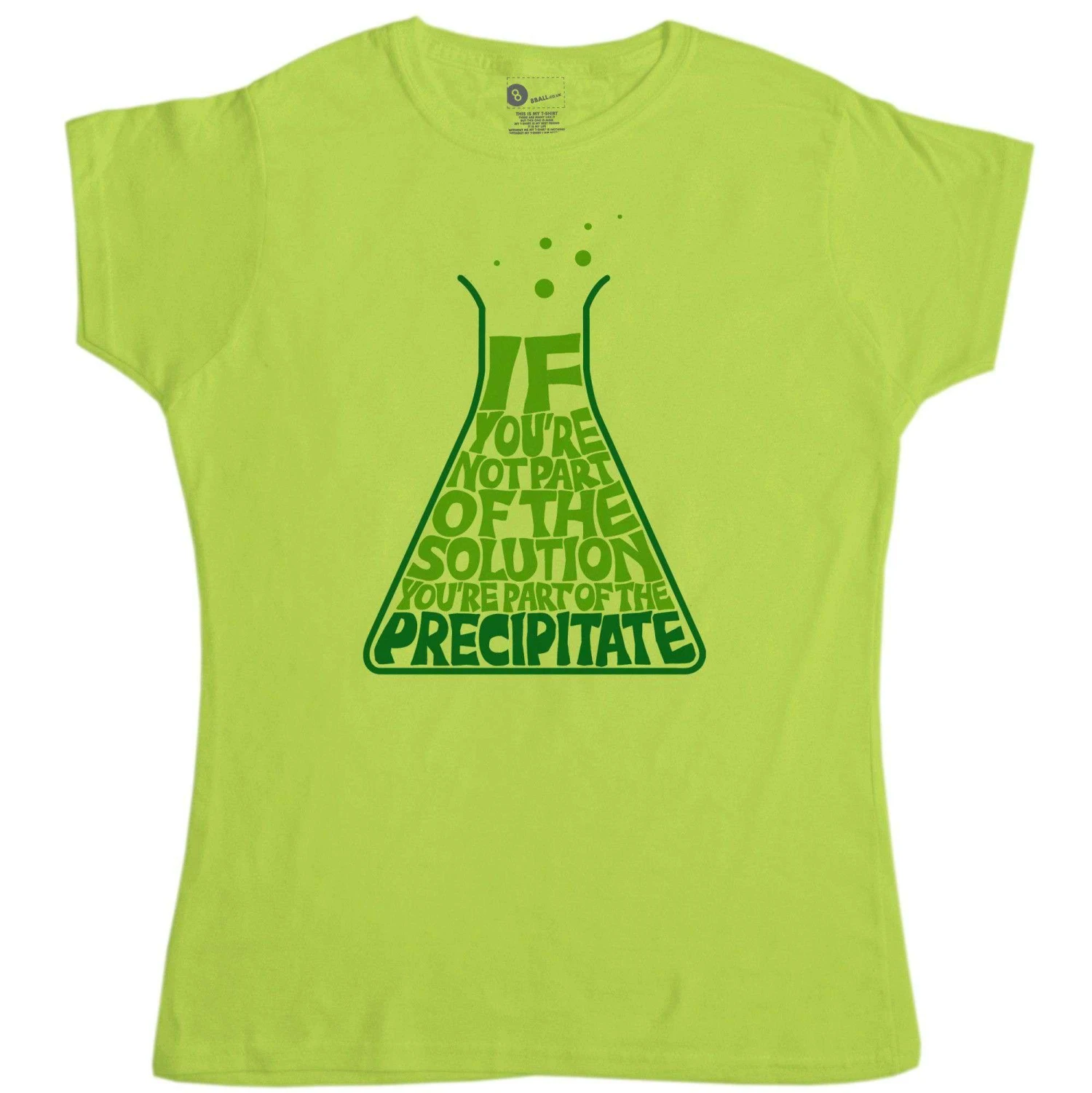 This super fun and trendy Science based design puts science into a cool illustrative slogan based women’s t-shirt with Precipitate as the topic. The slogan is ‘If you’re not part of the solution your part of the precipitate’ with the word precipitate in dark colour at the bottom. Get geeky and nerdy with this cracking science tee here at 8ball.
