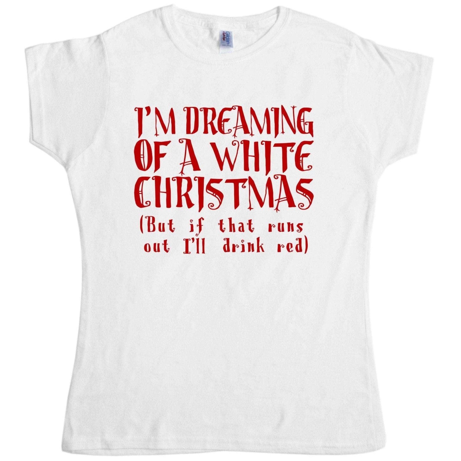 This ladies t-shirt features the slogan “I’m dreaming of a white Christmas (but if that runs out I’ll drink red)”. A great twist on a classic song title. This is one for all you wine enthusiast ladies out there! 100% cotton womens classic fit t shirt.
